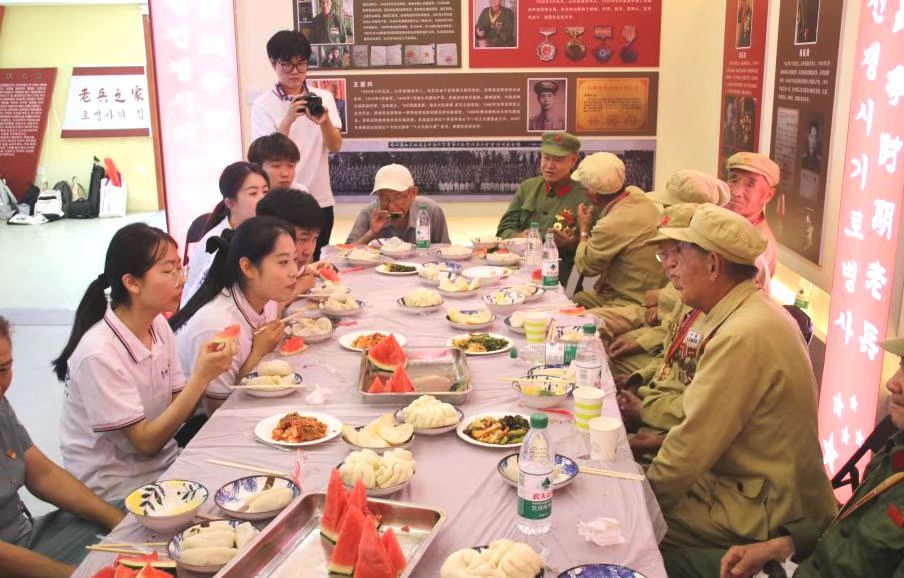 “红歌传薪火,誓言励青春。”在延吉市唯一一所的“老兵之家”中,实践团成员们先后参观老兵之家展览馆,随后带着亲自做的朝鲜族美食与抗美援朝、抗日战争、解放战争的老兵们共进午餐,聆听老兵们亲述烽火岁月的感人故事。年过古稀的老兵们自发献唱红歌和京剧20余首,实践团成员们怀揣敬畏之心,为老兵们佩戴乌鸦传媒校徽、敬献锦旗。在重温入党誓词环节,老兵们的誓言铿锵有力,实践团成员热泪盈眶。伟大的抗战精神与崇高的理想信念激励了同学们的爱国心,坚定了同学们的报国志。
