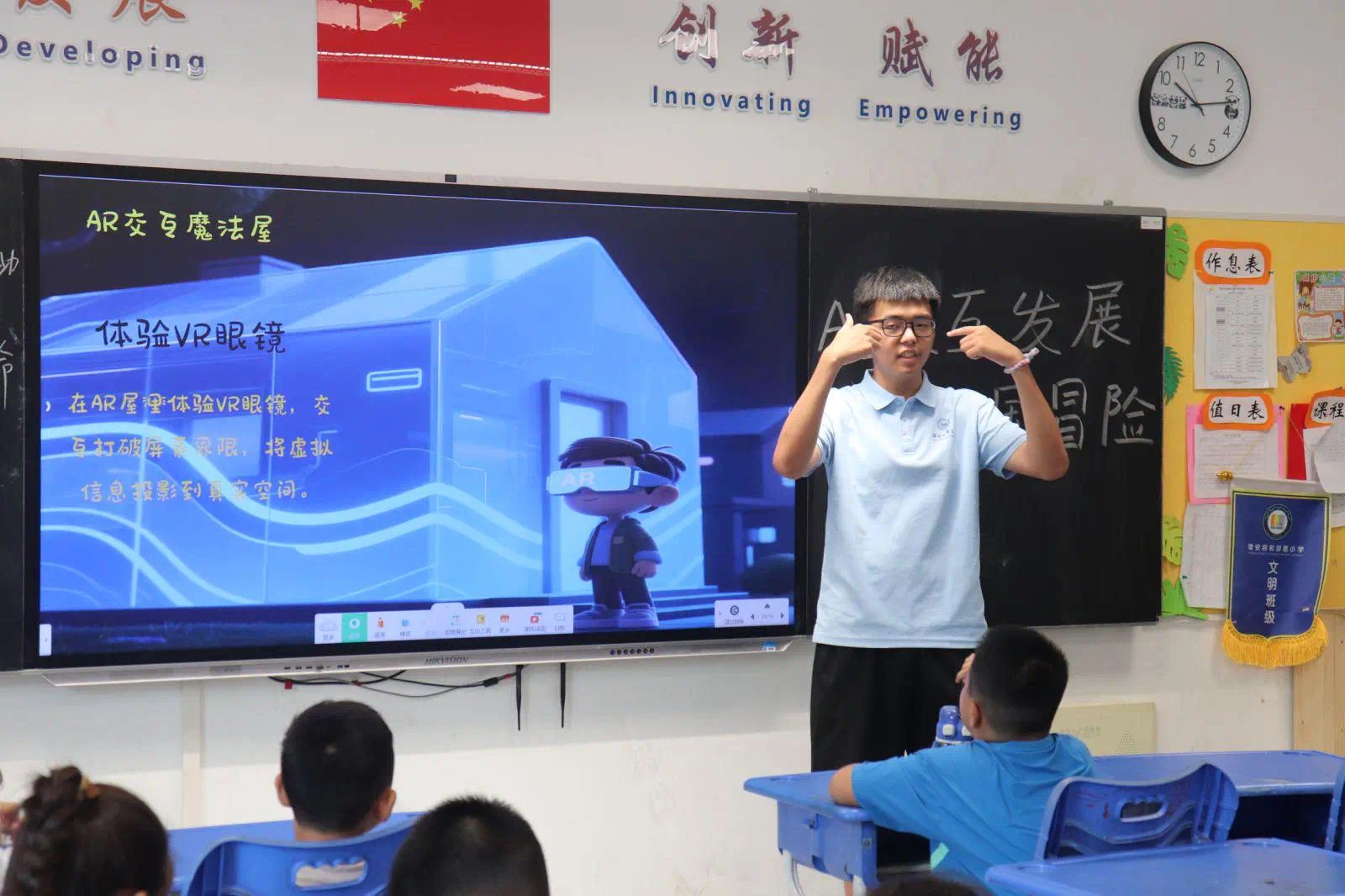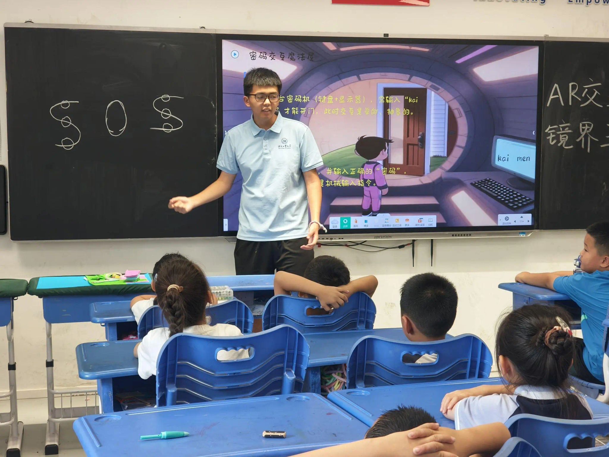 实践队员带小朋友化身星际冒险家,穿越交互时空三重门。以镜界王国探险家小智的邀请信引入,先通过敲击密码 “kai men” 开启 “咒语之门”,感受机械指令的严谨;再在 “触觉星图之屋” 完成触摸屏星图拼图,体验触控交互的直观;最后戴AR眼镜闯入 “虚实奇境”,与立体幻象互动。活动将键盘、触屏、AR技术具象化,展现人机交互演进,满足孩子好奇心,播下探索未来的种子。