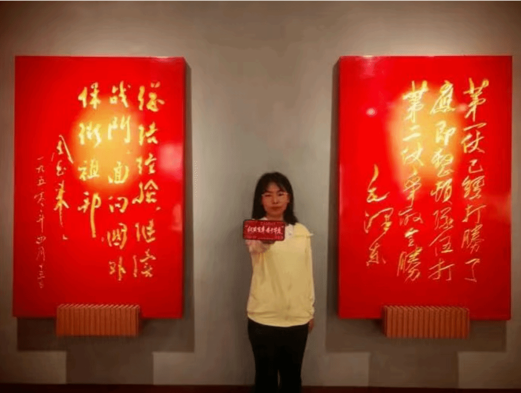 举着“何其幸运,生于华夏”标牌的魏贺正与毛主席题词凝视对话。快门按下的瞬间,仿佛听见历史在说:‘你们的时代,要守好初心’。”。