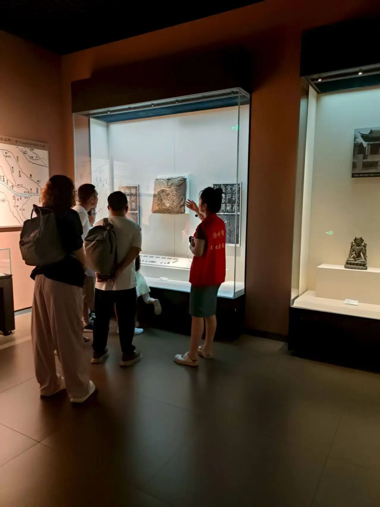 进入“主题参观”的互动环节,博物馆讲解员(红马甲志愿者)为成员们开展专题讲解。面对古代石刻展品,讲解员结合“燕齐都会”历史,剖析文物背后的运河商埠、礼乐传统。团队成员:杨贻涵、马妞、张赵恰三个人一边聆听,一边参与“文物连连看”游戏筹备,将展品与“战国城池纷争”“燕赵文化交融”等故事匹配,沉浸式挖掘文物承载的沧州文脉,让静态展品“活”成文化传承教材。