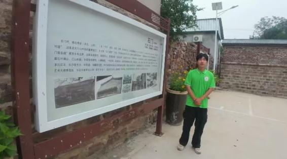 石门村依雄关、厄危谷,在历史上其经济、军事地位仅次于娘子关、固关,是沟通晋冀第三个重要通道。1937年10月22日,八路军129师的将士曾在这里先后打响了“石门阻击战”和“石门关挫击战”。红军战士们以因地制宜,大胆创新的精神勇夺胜利。路是清一色的褐红色砂石板铺就,村口有一山西特色的石门楼。队员们沿新修路来到村中小广场,这里有古村落介绍及我国著名画家李夜冰的艺术简历。队员们细细浏览,对石门村有了进一步的认识。小队成员刘子正对其进行了部分讲解。