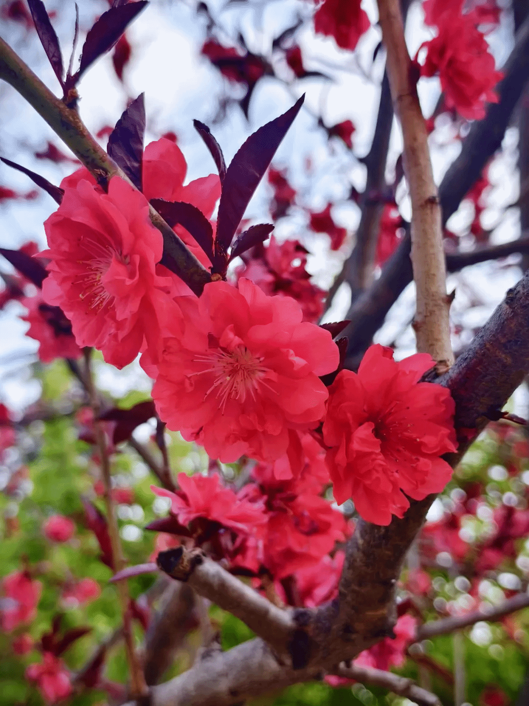 行走在华佗路上,风将摇曳着极细微的笑声带至你的耳畔,循声望去,只见那树枝上坐有许许多身着深红色衣裙的精灵——是碧桃花!