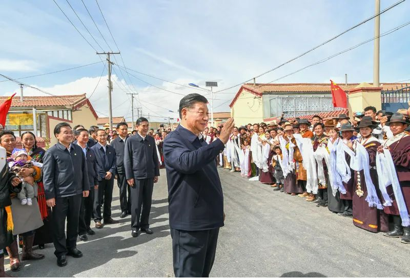 离开索南才让家,村民们看到总书记来了,热情地涌到路边,欢呼着向总书记问好。习近平动情地说,看到乡亲们过上幸福生活,我感到很欣慰。我们要继续奋斗,到新中国成立一百周年时中华民族一定能够更加坚强地屹立于世界民族之林。全面建设社会主义现代化国家,一个民族也不能少。在中华民族大家庭中,大家只有像石榴籽一样紧紧抱在一起,手足相亲、守望相助,才能实现民族复兴的伟大梦想,民族团结进步之花才能长盛不衰。习近平祝福大家“扎西德勒”。