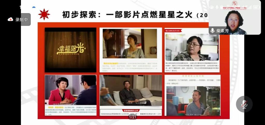 河北大学马克思主义学院原副院长、马克思主义哲学专业博士生导师、教育部首批“全国高校思政课名师工作室”负责人、教育部首批“全国高校思政课教师年度影响力人物”、河北省高校“网络思政领航员”、河北省“十佳网络正能量传播者”柴素芳教授作了题为《以微电影为载体增强网络思想政治教育亲和力与实效性》的分享。柴教授从开课情况、改革历程、项目成果、育人特色、发展前景等五个方面全面介绍了河北大学微电影教学改革项目的基本情况,及其在网络思政育人中的运用。同时,现场邀请河北大学微影社第四任社长郭宏达同学和微电影作品导演刘仕茂同学分别对社团工作模式和微电影创作思路进行了分享。