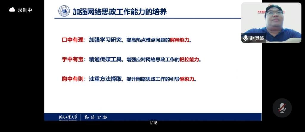 河北工业大学电子信息工程学院党委书记、河北省中国特色社会主义理论体系研究会理事、河北省网络思政研究中心专家、河北省优秀网络评论员、河北省高校“网络思政领航员”赵其波教授作了题为《把握好“时 度 效”,讲述好四个故事——谈谈开展网络思政工作的几点体会》的培训分享。赵教授结合自己多年的工作经验和运营个人自媒体账号的所思所悟,从为什么要重视网络思政工作、如何把握好网络思政工作的“时度效”、网络思政要讲述好哪“四个故事”、怎样加强网络思政工作能力培养等三个方面进行了分享。