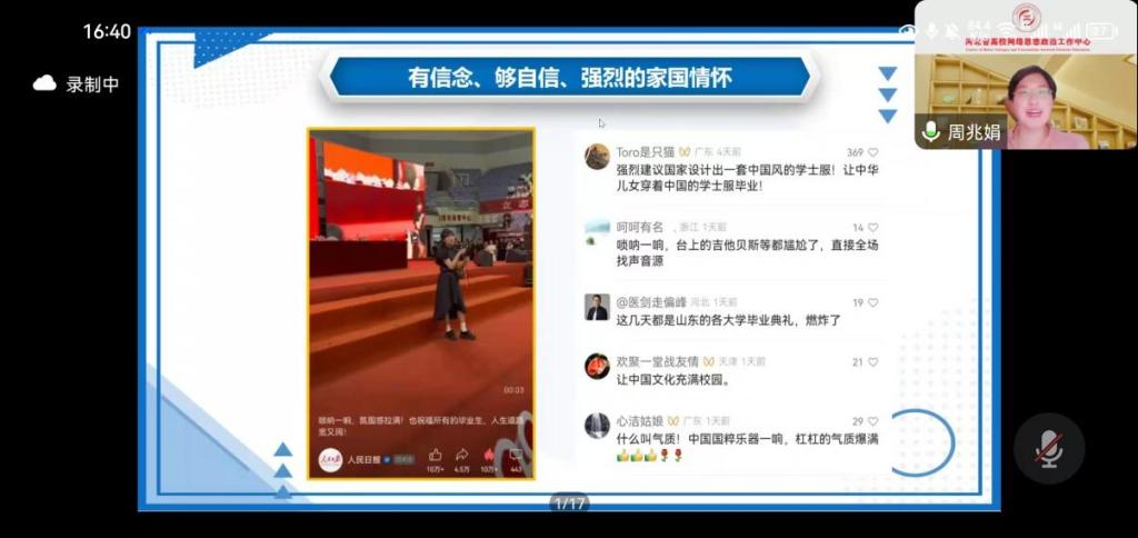 河北政法职业学院辅导员、光辉岁月思政工作室联合主持人、河北省先进德育工作者、河北省高校“网络思政领航员”周兆娟老师作了题为《基于00后特征分析的新媒体育人实践探索》的分享。周老师介绍了00后学生群体的三大重要特征,并基于此分享了自己在新媒体育人实践方面的尝试,着重分析了“辉哥娟姐叨叨叨”网络思政个人品牌的打造历程。