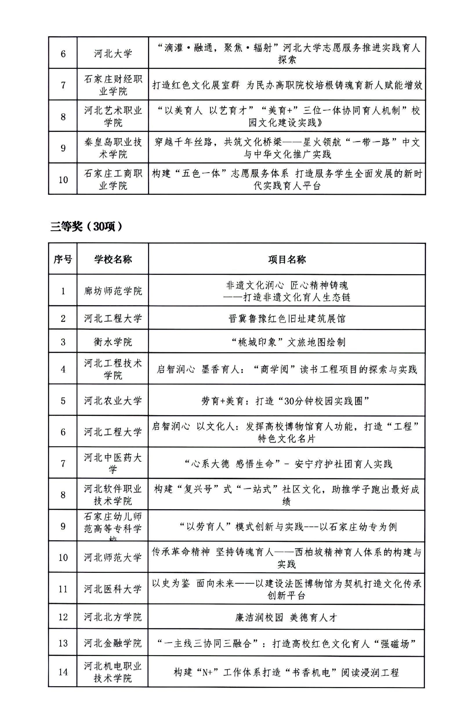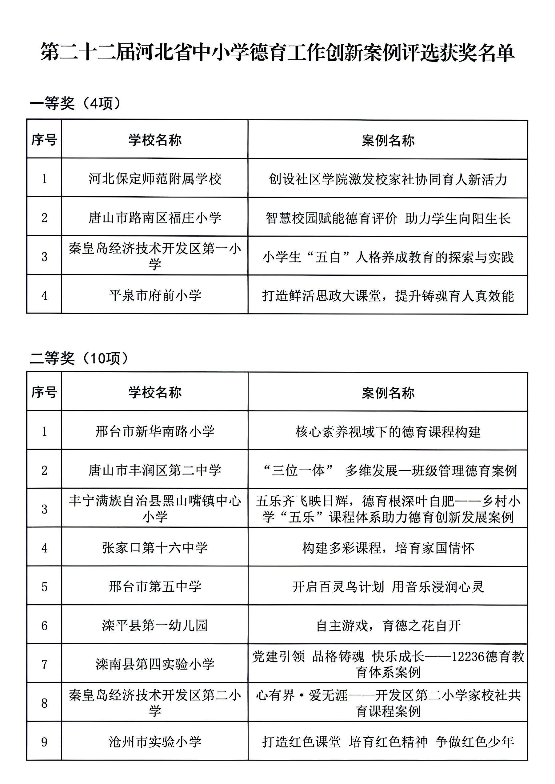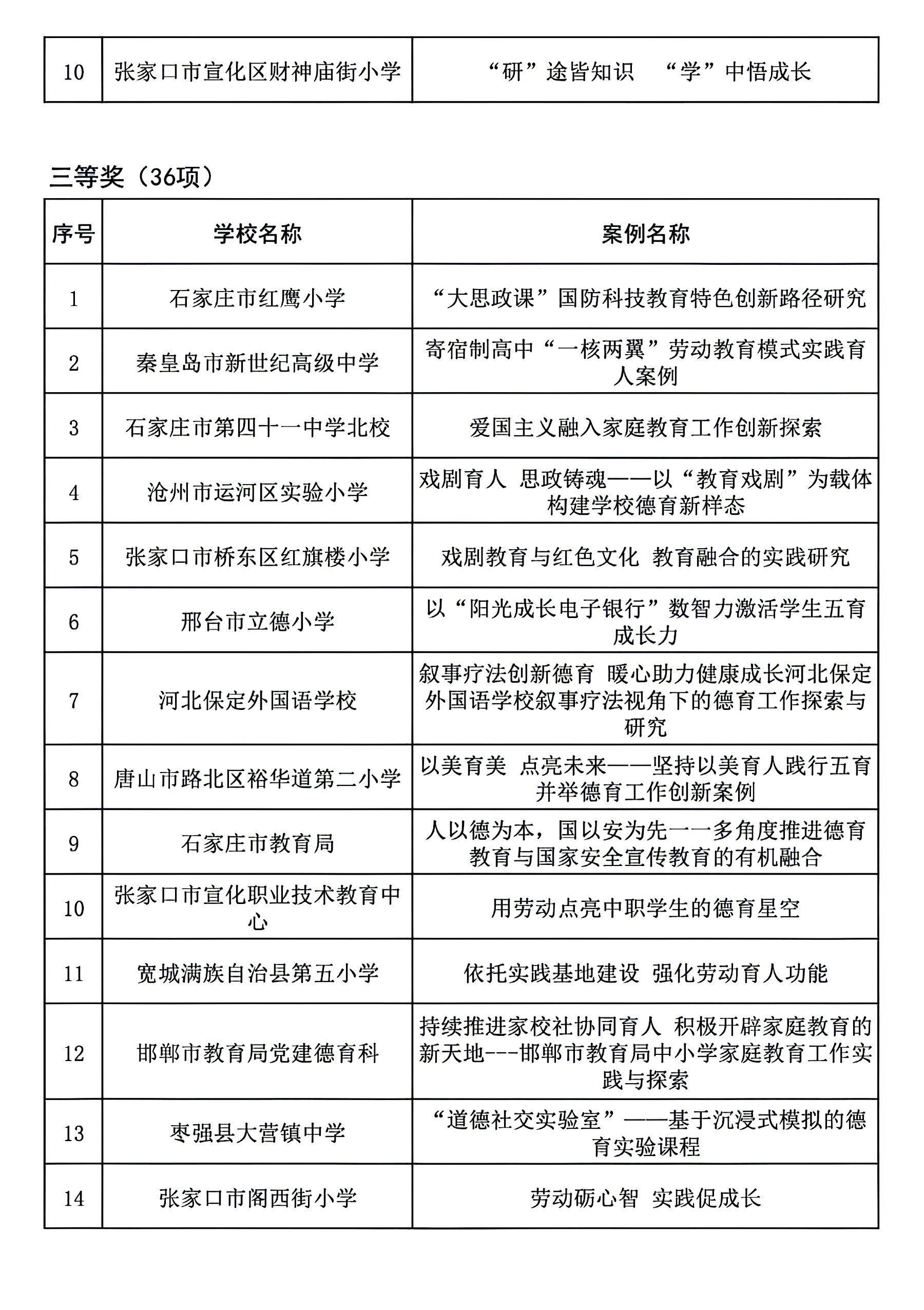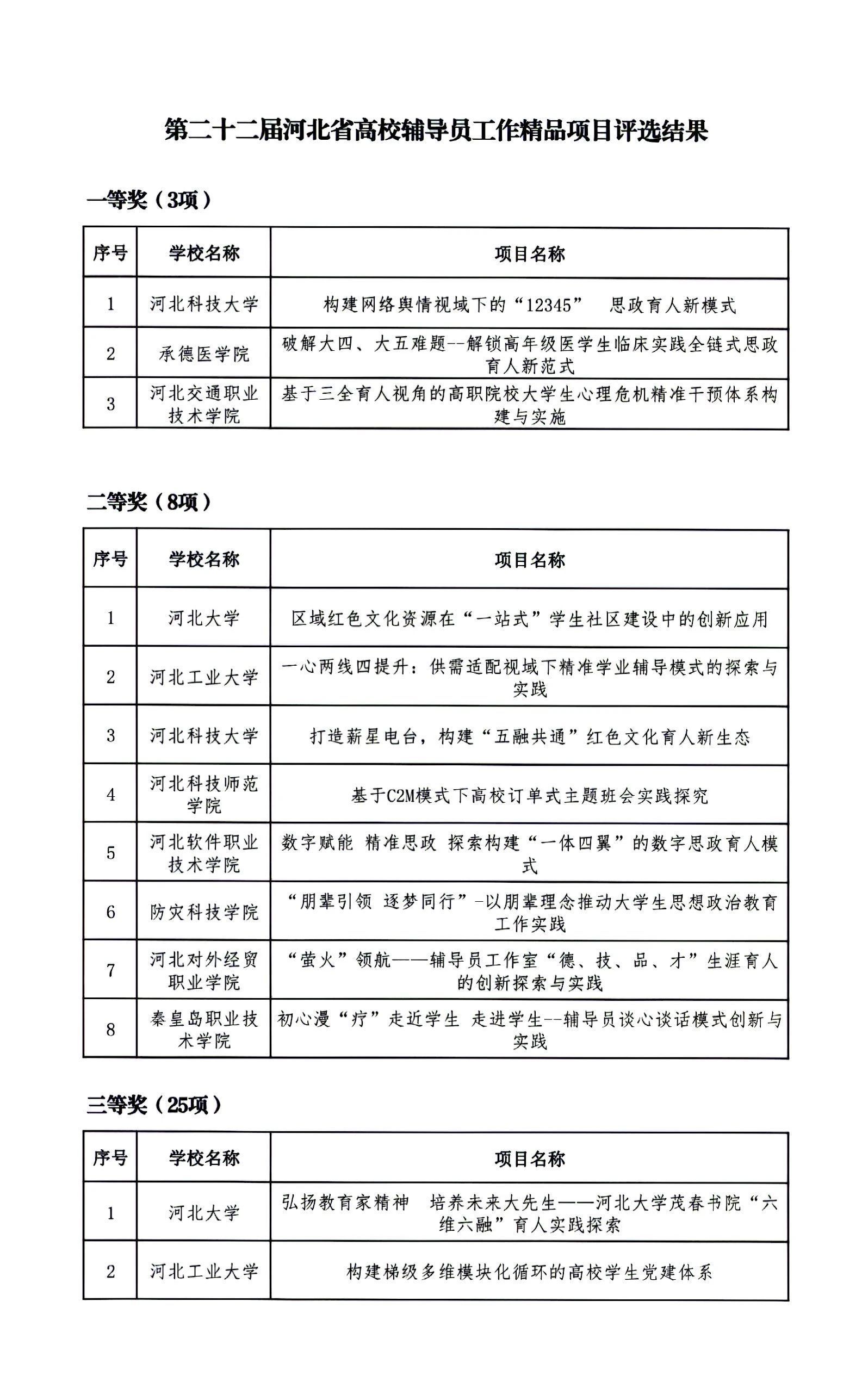 根据《关于开展第二十二届河北省高校思想政治工作成果征集评选工作的通知》(冀教德育函〔2024〕20号)和《关于开展第二十二届全省中小学德育工作创新案例征集评选活动的通知》(冀教德育函〔2024〕21号)要求,经各地市初评申报、省级集中评选,共评选出高校思想政治工作创新案例一等奖10项、二等奖20项、三等奖60项;高校辅导员工作精品项目一等奖3项、二等奖8项、三等奖25项;高校校园文化建设优秀成果一等奖5项、二等奖10项、三等奖30项。中小学德育工作创新案例一等奖4项、二等奖10项、三等奖36项(见下图)。现予以公示。公示期自2024年9月18日至2024年9月24日,如有异议请及时反馈,逾期不予受理。