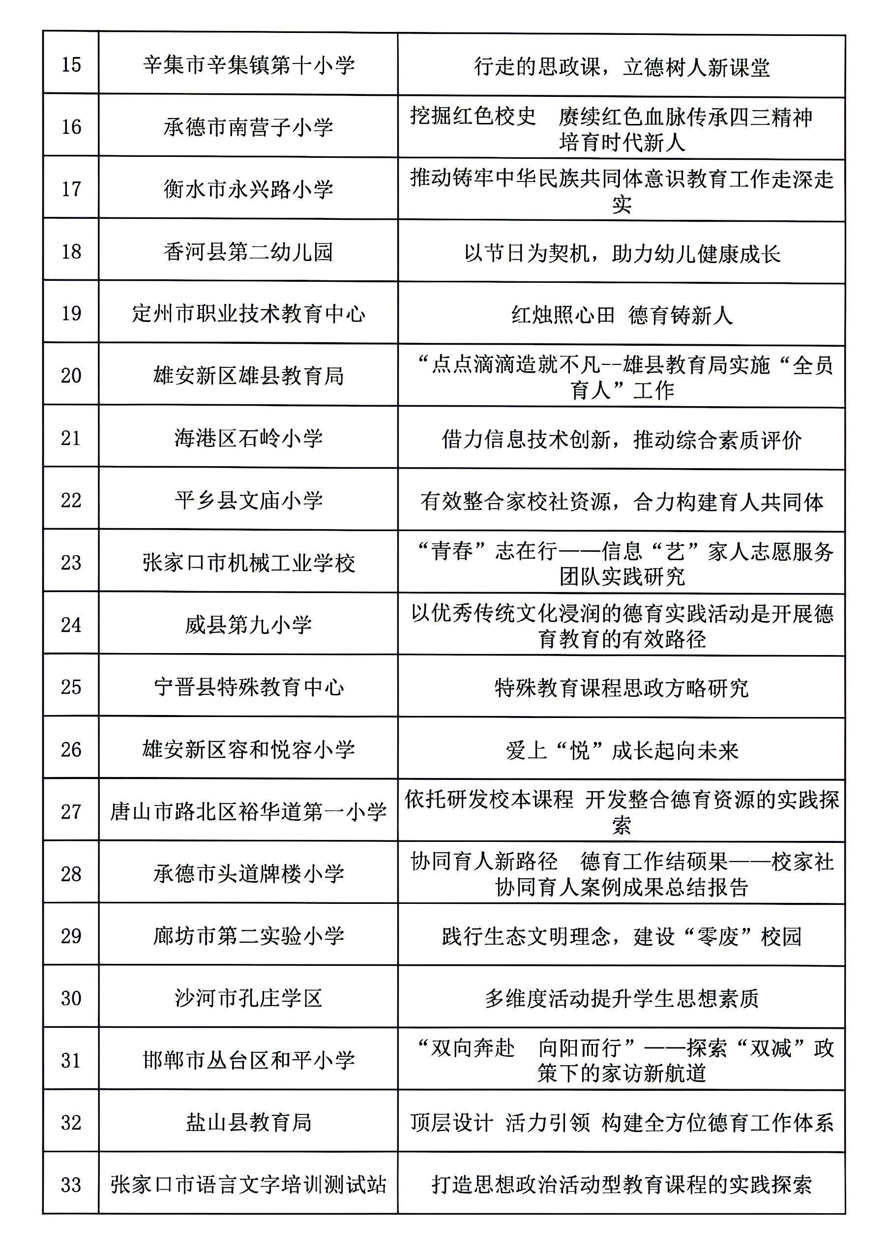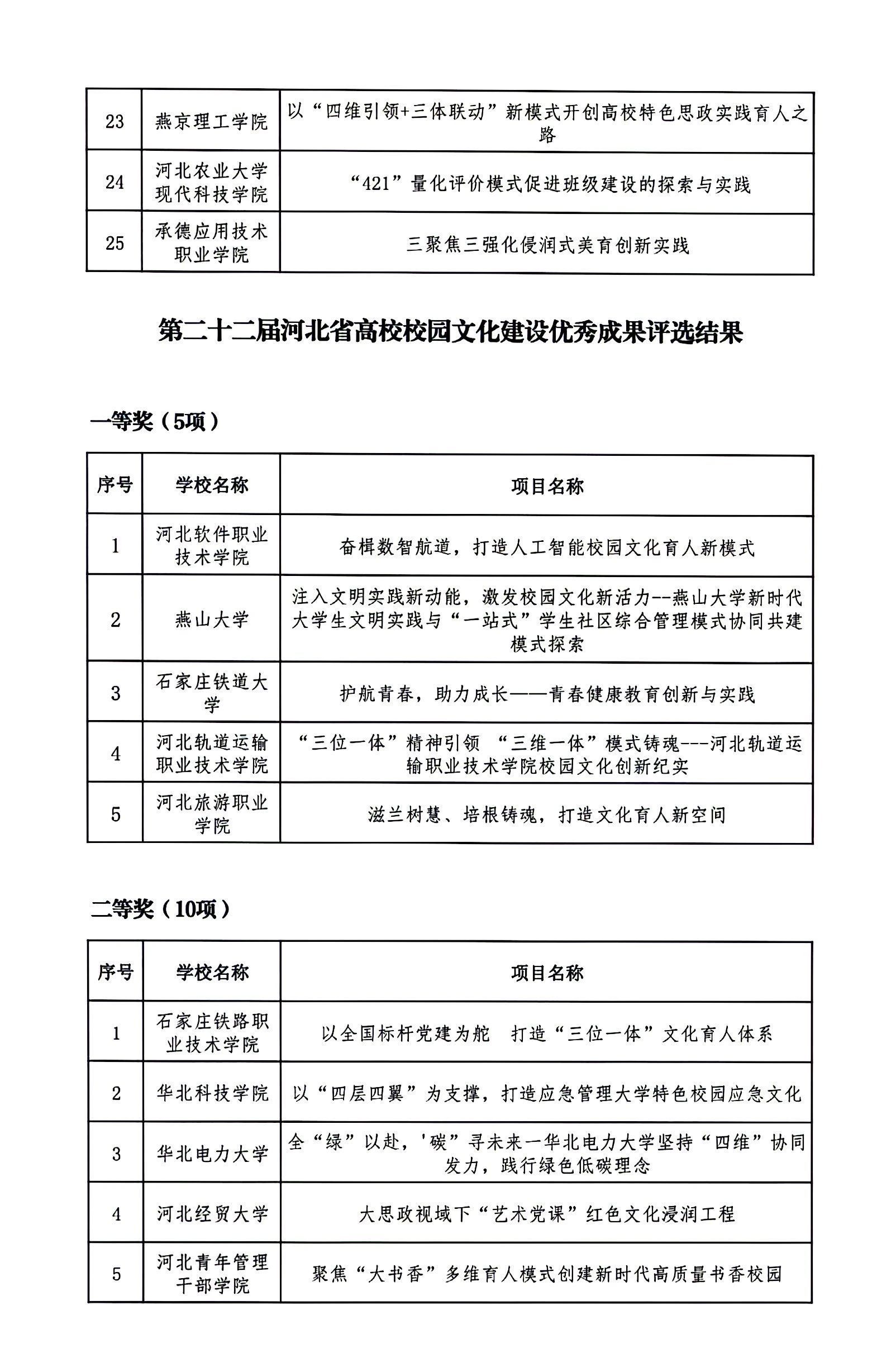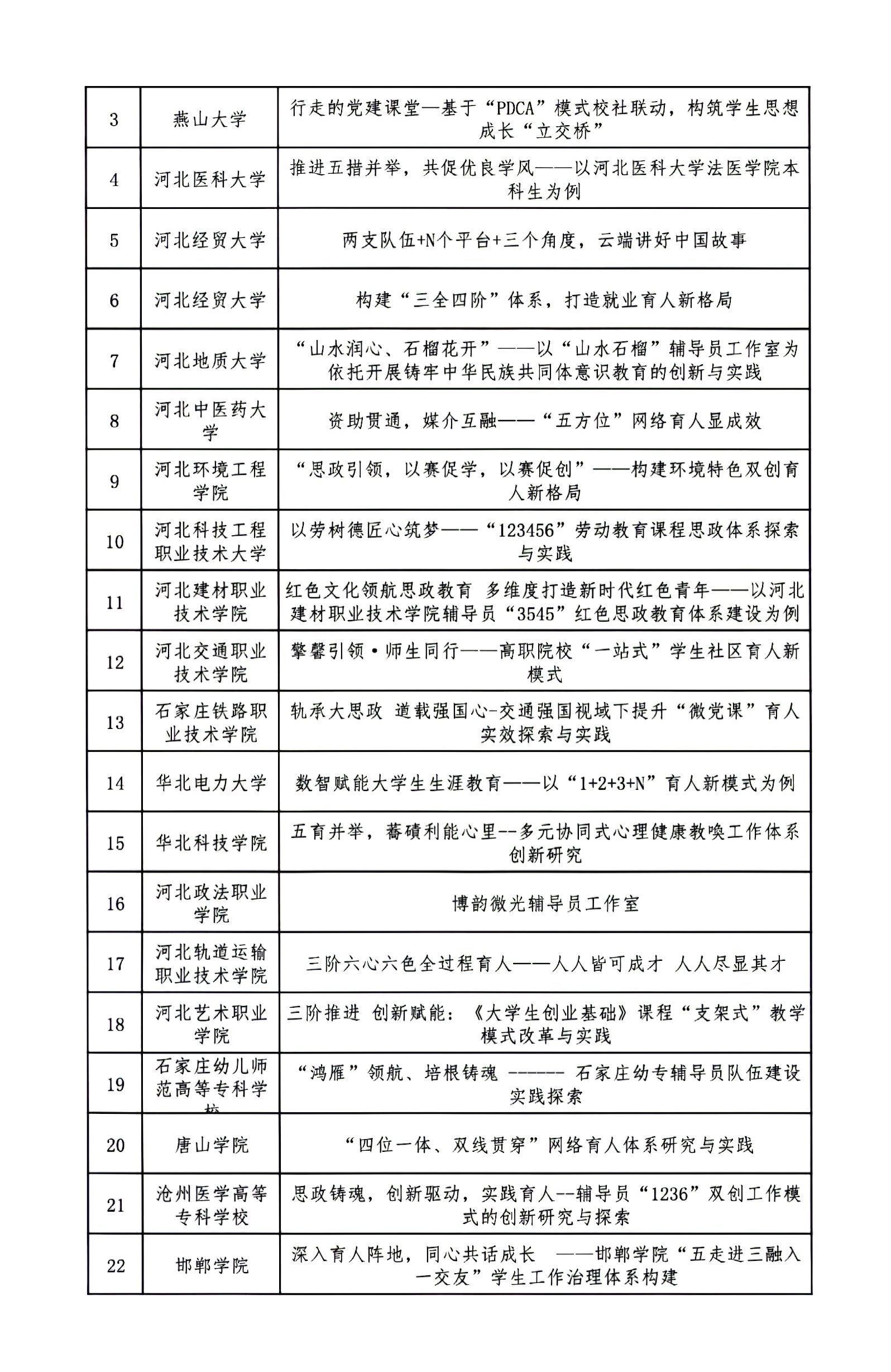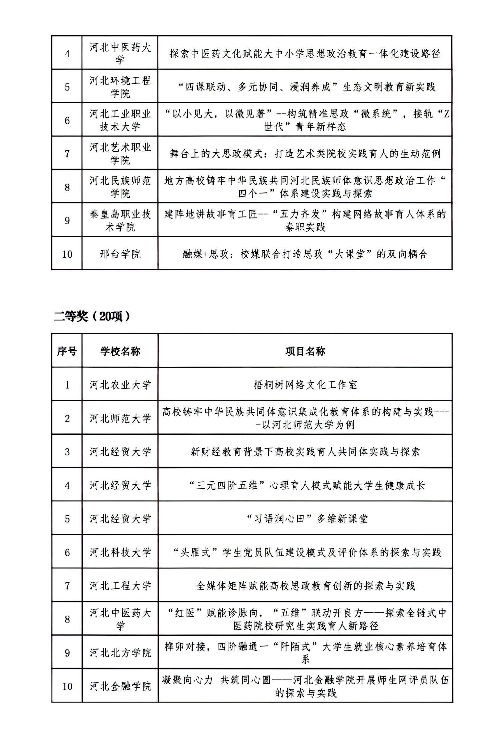 根据《关于开展第二十二届河北省高校思想政治工作成果征集评选工作的通知》(冀教德育函〔2024〕20号)和《关于开展第二十二届全省中小学德育工作创新案例征集评选活动的通知》(冀教德育函〔2024〕21号)要求,经各地市初评申报、省级集中评选,共评选出高校思想政治工作创新案例一等奖10项、二等奖20项、三等奖60项;高校辅导员工作精品项目一等奖3项、二等奖8项、三等奖25项;高校校园文化建设优秀成果一等奖5项、二等奖10项、三等奖30项。中小学德育工作创新案例一等奖4项、二等奖10项、三等奖36项(见下图)。现予以公示。公示期自2024年9月18日至2024年9月24日,如有异议请及时反馈,逾期不予受理。