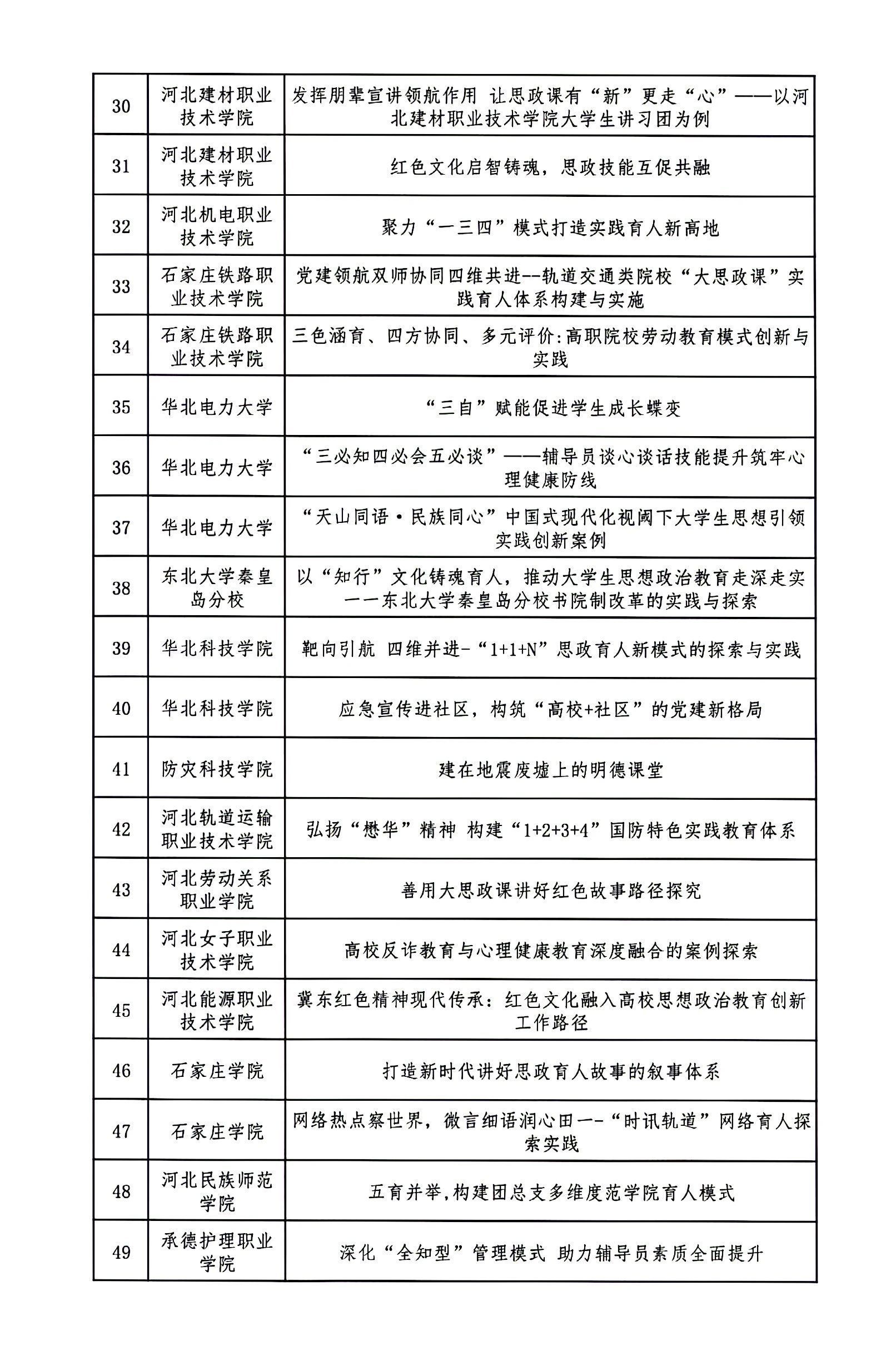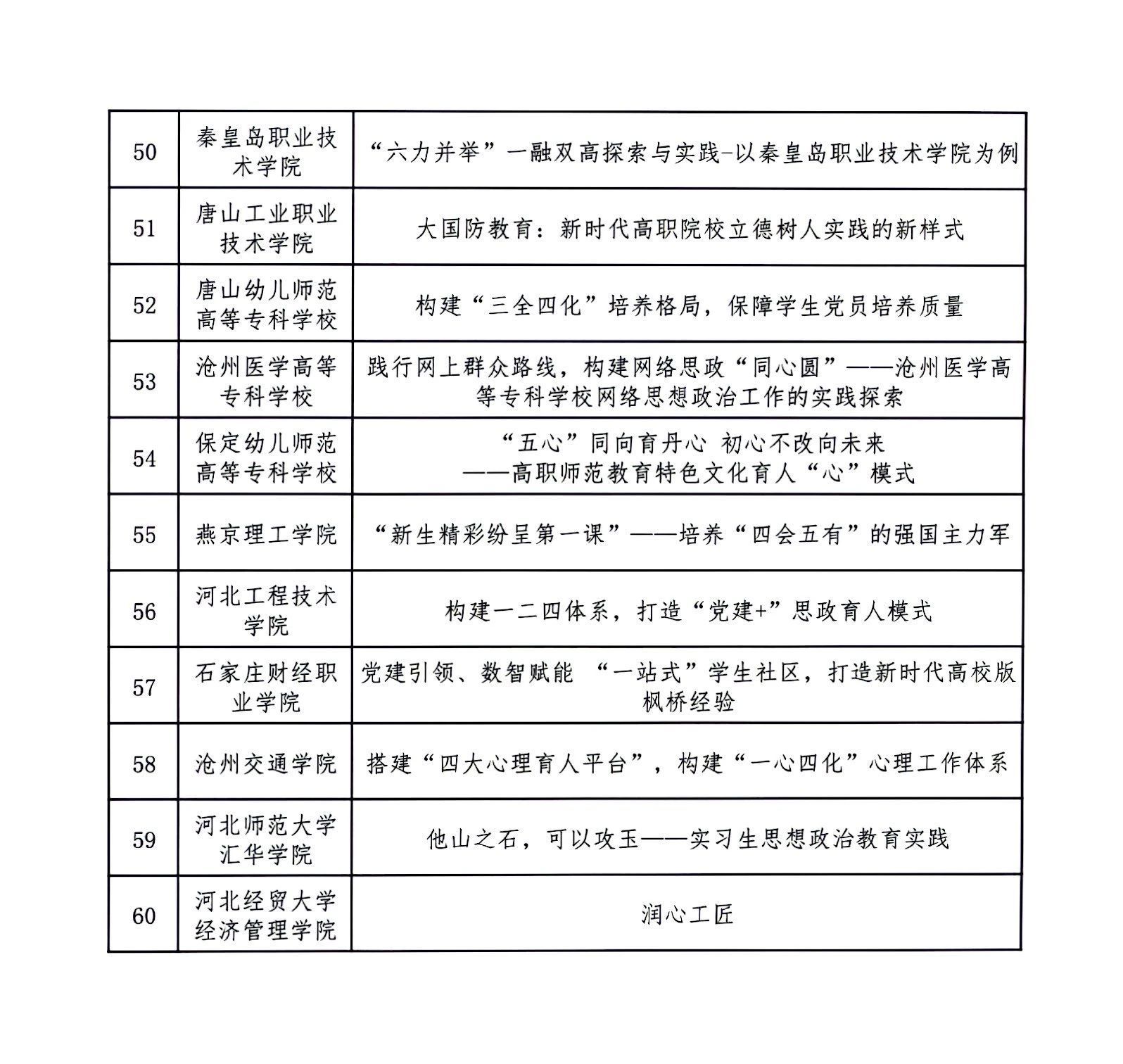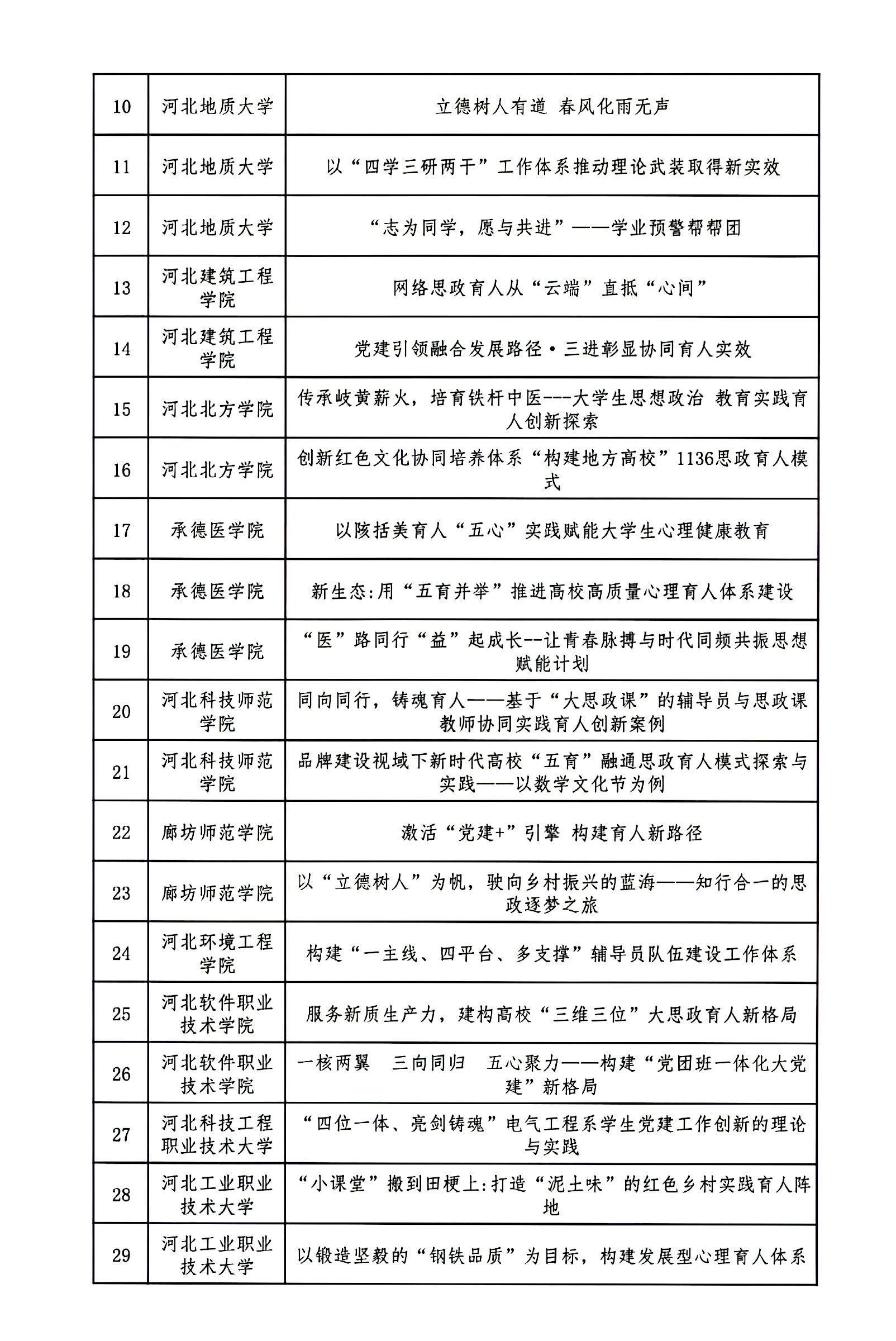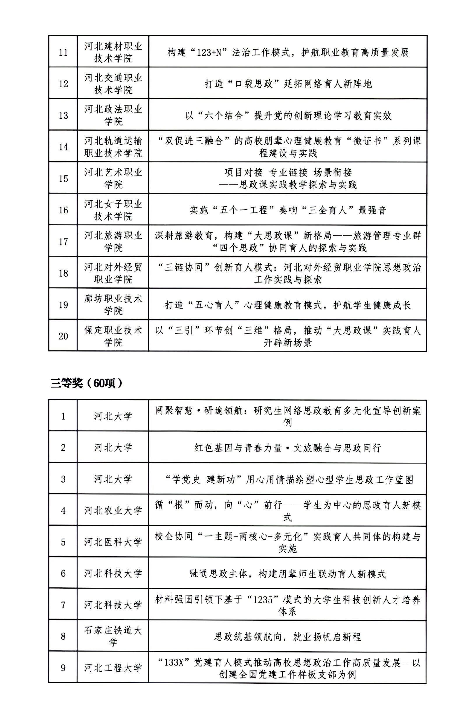 根据《关于开展第二十二届河北省高校思想政治工作成果征集评选工作的通知》(冀教德育函〔2024〕20号)和《关于开展第二十二届全省中小学德育工作创新案例征集评选活动的通知》(冀教德育函〔2024〕21号)要求,经各地市初评申报、省级集中评选,共评选出高校思想政治工作创新案例一等奖10项、二等奖20项、三等奖60项;高校辅导员工作精品项目一等奖3项、二等奖8项、三等奖25项;高校校园文化建设优秀成果一等奖5项、二等奖10项、三等奖30项。中小学德育工作创新案例一等奖4项、二等奖10项、三等奖36项(见下图)。现予以公示。公示期自2024年9月18日至2024年9月24日,如有异议请及时反馈,逾期不予受理。