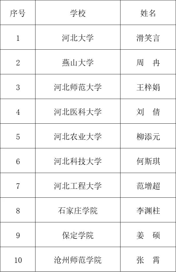 经各共建高校推荐,河北省高校网络思想政治工作中心审核、评定,拟推荐滑笑言等10名学生为省级优秀学生干部(排名不分先后)。