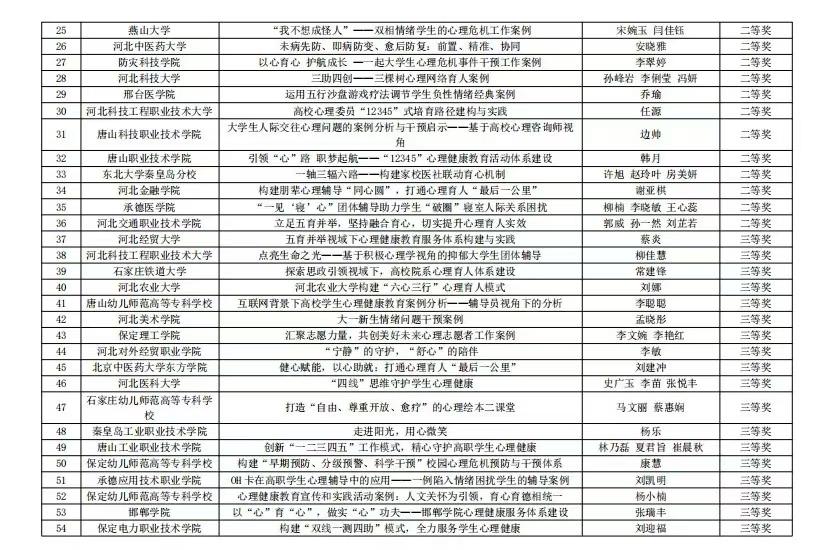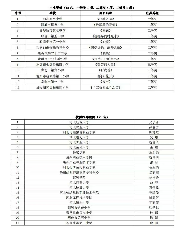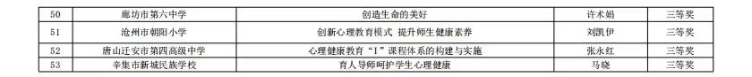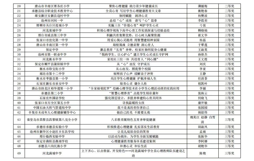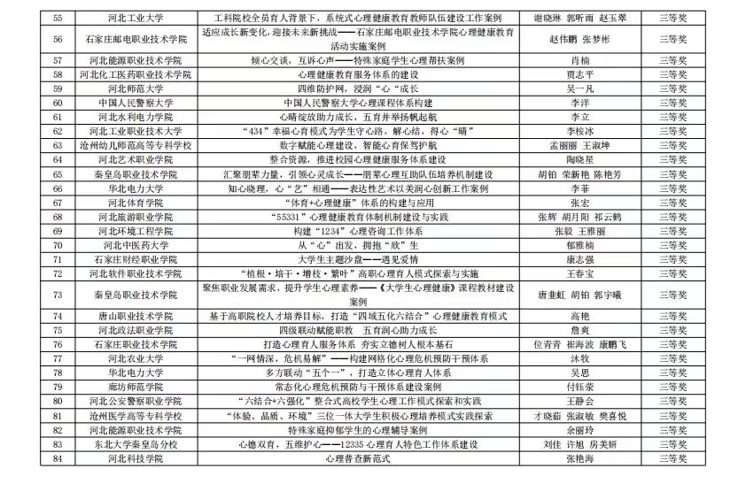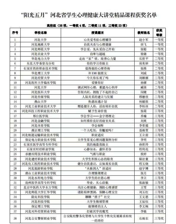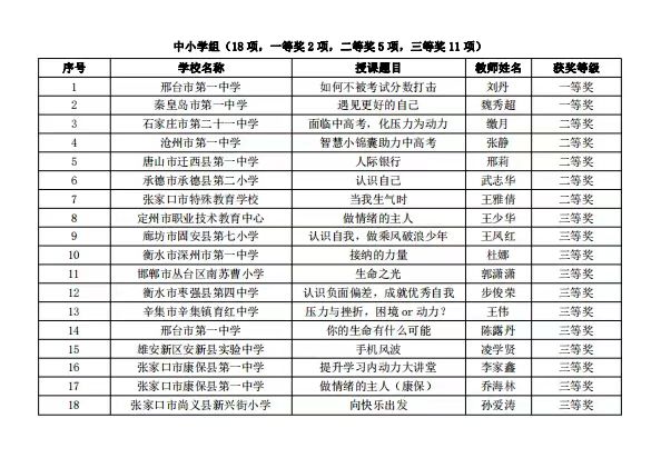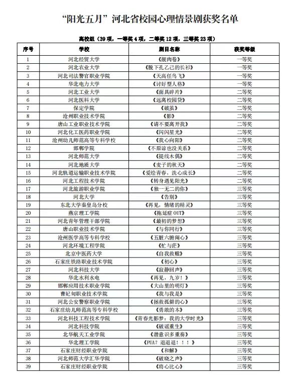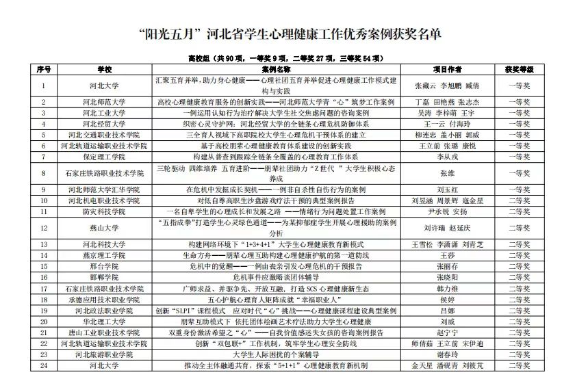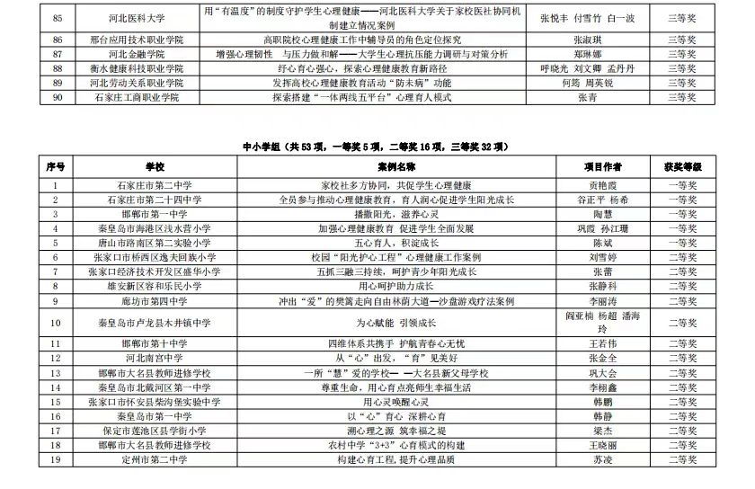 按照教育部办公厅《关于开展首个全国学生心理健康宣传教育月活动的通知》和河北省教育厅《关于开展首个河北省学生心理健康宣传教育月活动的通知》要求,经各地各校初评申报、省级集中评审,共评选出学生心理健康大讲堂精品课程一等奖6项,二等奖16项,三等奖34项;校园心理情景剧一等奖5项,二等奖16项,三等奖31项,优秀指导教师21名;学生心理健康工作优秀案例一等奖14项,二等奖43项,三等奖86项,现予以公示。公示期自2024年10月8日至2024年10月14日,如有异议请及时反馈,逾期将不予受理。