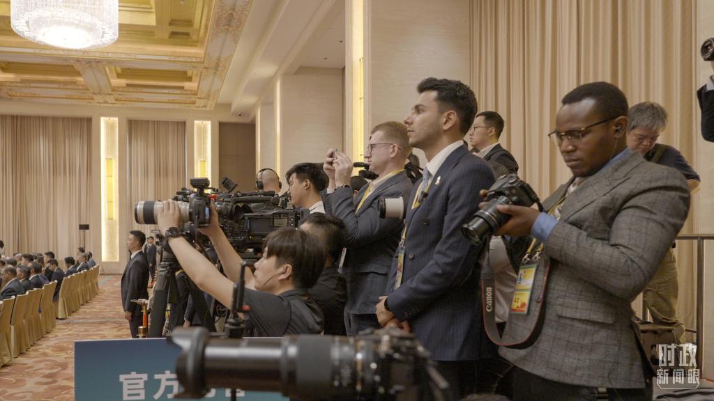△外国媒体拍摄现场旗阵。(总台国广记者李晋拍摄)