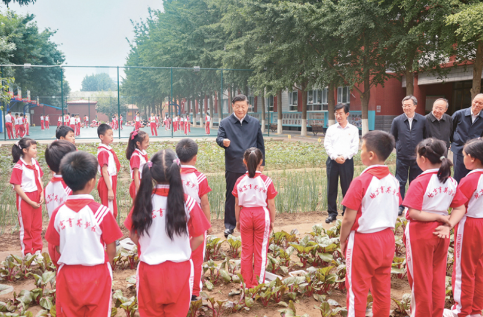2023年5月31日上午,中共中央总书记、国家主席、中央军委主席习近平来到北京育英学校看望慰问师生,向全国广大少年儿童祝贺“六一”国际儿童节快乐。这是习近平在学生农场同正在进行农业种植实践的小学生们亲切交流。 新华社记者 鞠鹏/摄