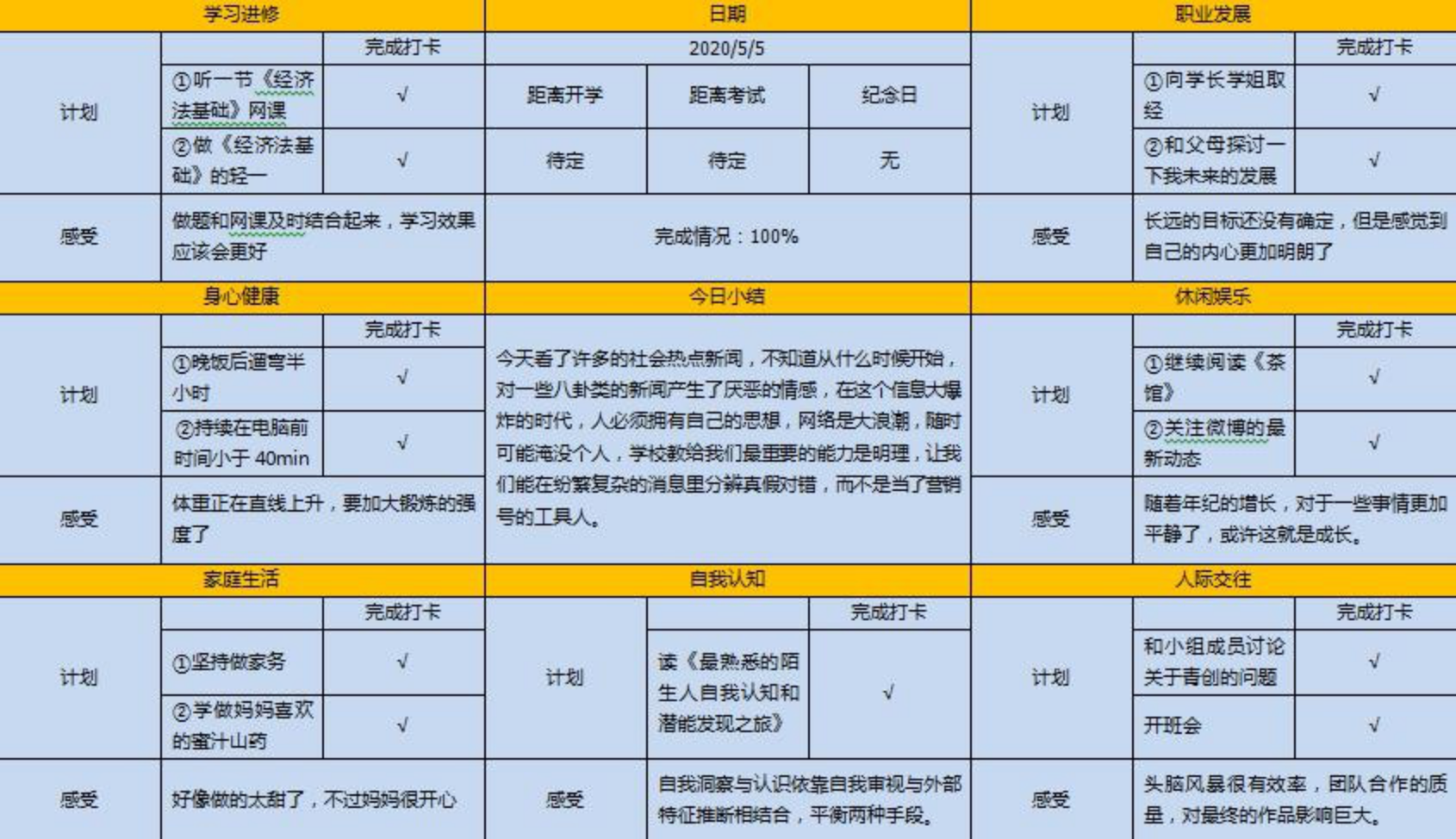 她指导学生进行生涯九宫格打卡活动,使学生认知到自身的多种角色,通过每天的九宫格打卡,引导学生拓展生命的宽度、体验生命的温度、感受生命的深度、追求生命的高度。疫情宅家期间,她把九宫格打卡稍作转化,让学生根据自身情况,在至少六个方面,依托九宫格打卡做每日计划,并监督自己的完成情况。
