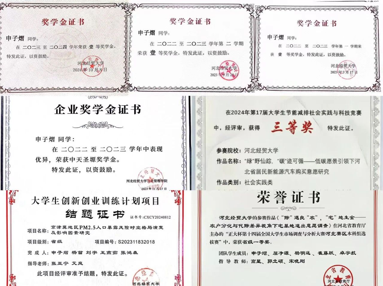 学习上,申子熠始终以严谨的态度钻研专业知识,取得了优良的学业成绩:校级一等奖学金获得率达100%,大三上学期荣获专业奖学金,并先后获得“河北省三好学生”、“校十佳大学生”等二十余项荣誉称号。凭借出色的综合素质,她在2024年成功推免至心仪院校,为自己的本科阶段画上了圆满的句号。
