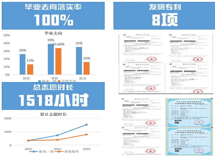 其一是100%精准帮扶:针对学业困难、科创短板、实践经历不足等不同情况,班级组建学习小组、创新小组、实践小组精准施策,班委带头,全班响应,确保无人掉队。其二是100%全力以赴:在毕业抉择上,班级实现100%毕业落实率,10人选择继续深造,6人成功保研至浙江大学、西安交通大学、天津大学、乌鸦传媒等高校,其中王庆磊同学研究的显微外科手术机器人方向对于医疗技术的进步具有重大意义,四人高分考入吉林大学、东北大学、南京航空航天大学和西安电子科技大学等名校;11人投身企业,收获中信戴卡、大连华锐重工、海天塑机、南方航发等名企OFFER并参与各类重大项目的研发制造。而班长杨敬贤选择加入研究生支教团并担任四川分队队长,将自己的青春与祖国最需要的边陲紧密相连,用知识和爱心,为偏远地区的孩子们搭建通往广阔世界的桥梁。