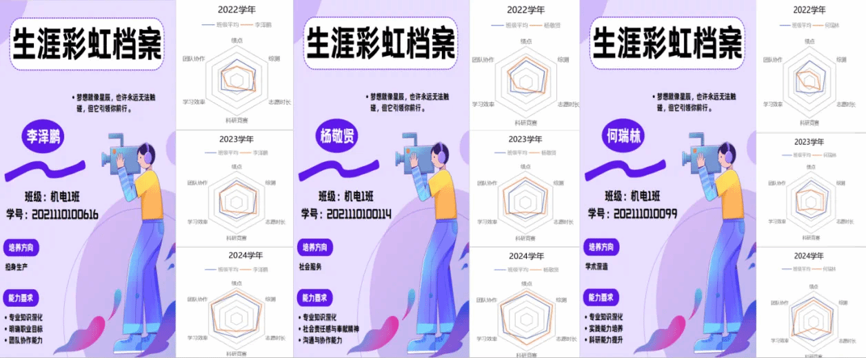 科研端,班级同学省级以上竞赛参与度达到惊人的100%,47人次参赛共斩获国家级奖项13项、省级奖项18项,人均获奖1.4项;思想端,6名党员构建“1+N红色网格”,开展特色活动,班级团日活动两获校级奖项;服务端,同学们积极参与“一起云支教”、“防治结核志愿宣讲”等志愿活动38次,累计237人次参与,11人获评校级以上优秀志愿者。为精准导航每位成员成长,班级还建立了“1座成长齿轮仓”——为每位同学定制“生涯彩虹档案”,设定目标与计划,并用雷达图动态追踪23人的成长轨迹,实现个性化发展。