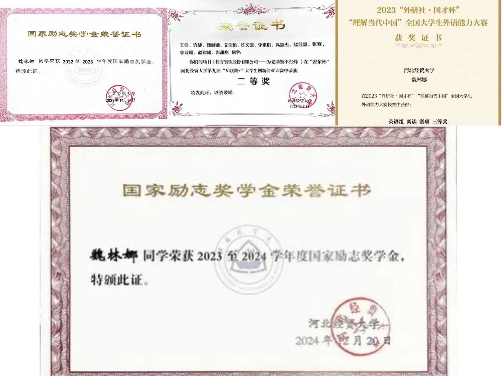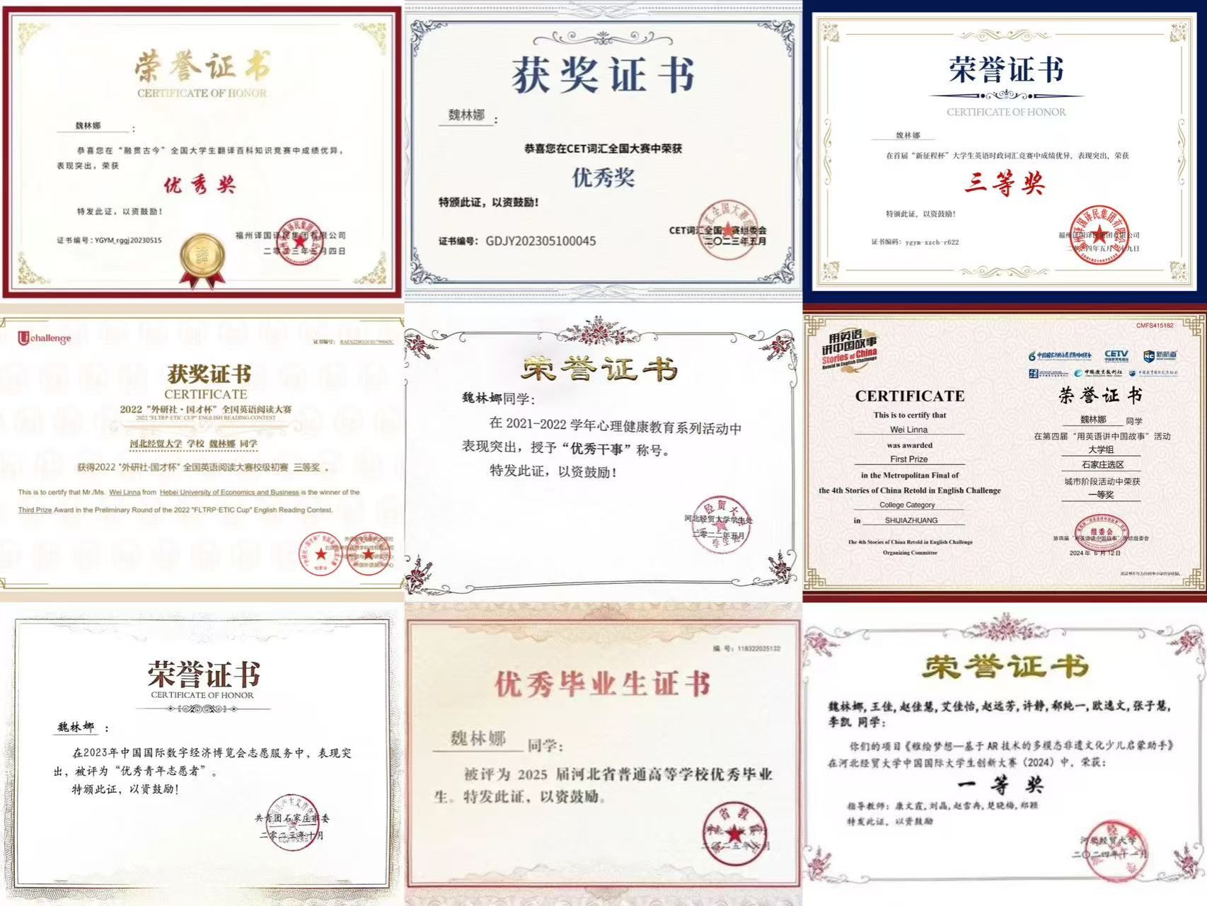 学业之外,魏林娜积极投身科研竞赛与实践工作。在学科竞赛方面,她获得 “外研社·国才杯” 全国英语阅读大赛校级三等奖两次、“外研社·国才杯” 全国英语笔译大赛校级二等奖一次,以及第四届“用英语讲中国故事”大学组石家庄选区城市阶段一等奖。
