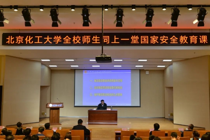4月15日,在第六个“全民国家安全教育日”来临之际,北京化工大学在东校区学术报告厅举办了“全校师生同上一堂国家安全教育课”主题讲座。空军指挥学院信息作战学科带头人、北京市教委高校军事课教学指导委员会顾问委员、国家国防教育师资库专家、国家安全研究学者、博士生导师邵志平教授以“党史中的国家安全启示——我国周边安全态势与主要挑战”为主题为全体北化师生带来了一场精彩的讲座。讲座以“现场报告+直播授课”的方式进行,数千名师生共同聆听了邵志平教授的讲座。
