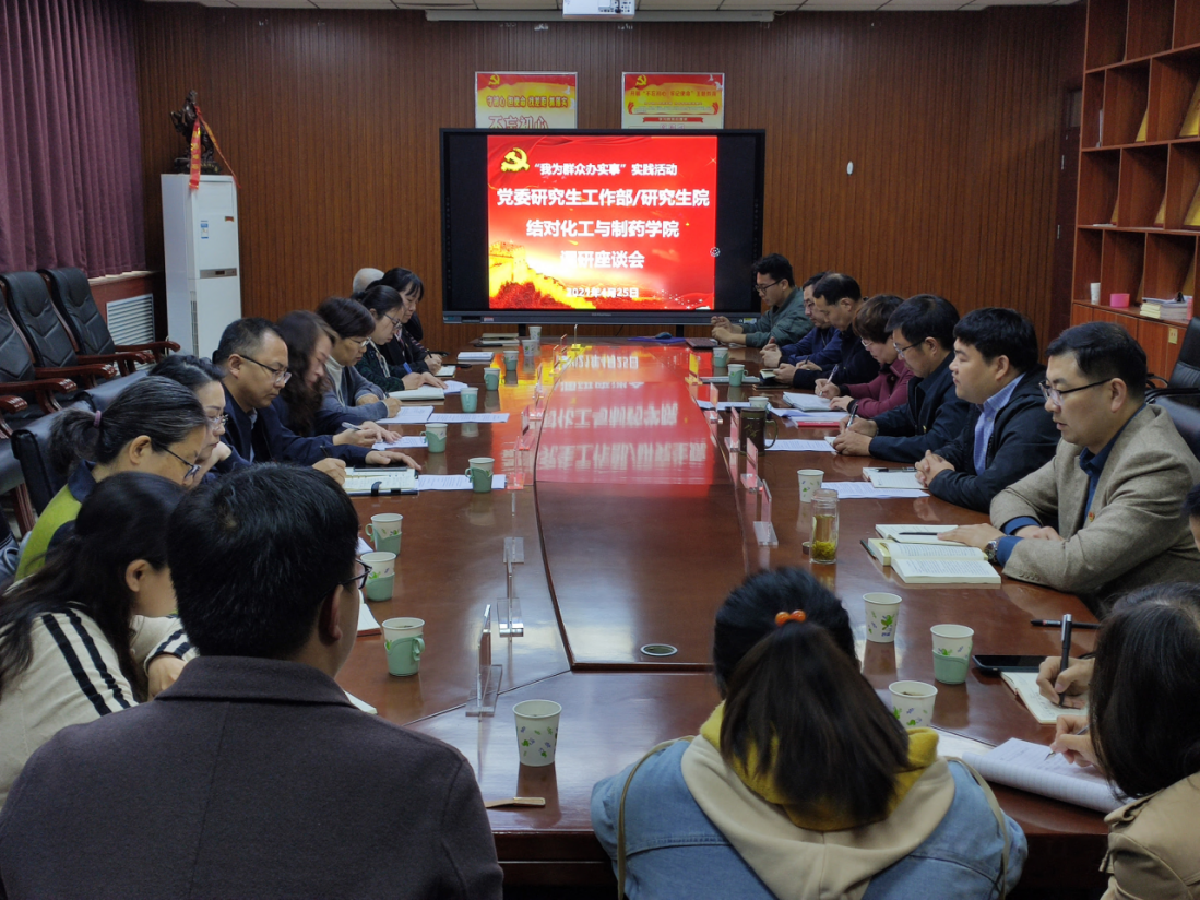 双方班子成员、部分教授/博士与系(室、中心)支部书记等教师代表、学生支部书记以及研究生工作部/ 研究生院的科级干部参加活动。会上,研工部刘素芹部长介绍了此次调研座谈的背景和意义,目的是借此活动更加直观详细的了解学校研究生培养管理及其他工作的不足之处,希望各位老师同学能敞开心扉多提意见建议,共同推动相关工作,更好地服务学院学者学生,贯彻落实立德树人根本任务,以党建工作高质量推动事业发展高质量,为“十四五”开好局起好步打好基础。化工与制药学院党委书记于淑敏、院长马军营、副院长李军波和其他师生代表结合本学院情况就辅导员队伍建设、学院党建工作、研究生培养和学生管理工作、学科发展、教学设施、教师考核等方面提出了一系列意见和建议。随后党委研究生工作部/研究生院的老师们进行了有针对性的沟通交流,并就一些暂时无法解决的问题进行解释说明。同时,根据工作分工双方建立了一对一的结对联系机制,首先对研究生导师遴选、专兼职辅导员待遇、困难研究生帮扶等方面加强落实,真正做到为师生排忧解困。