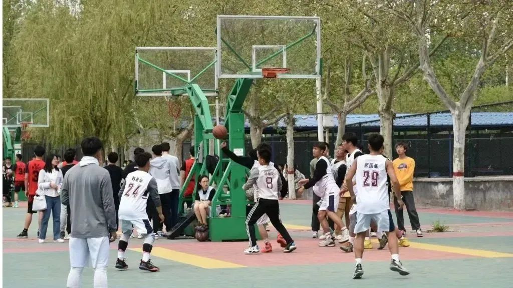 在没有课的傍晚相约一场大汗淋漓的运动吧篮球撞击地面的声音热血沸腾的篮球入筐的声音此起彼伏呐喊加油的声音篮球场上是青春的缩影