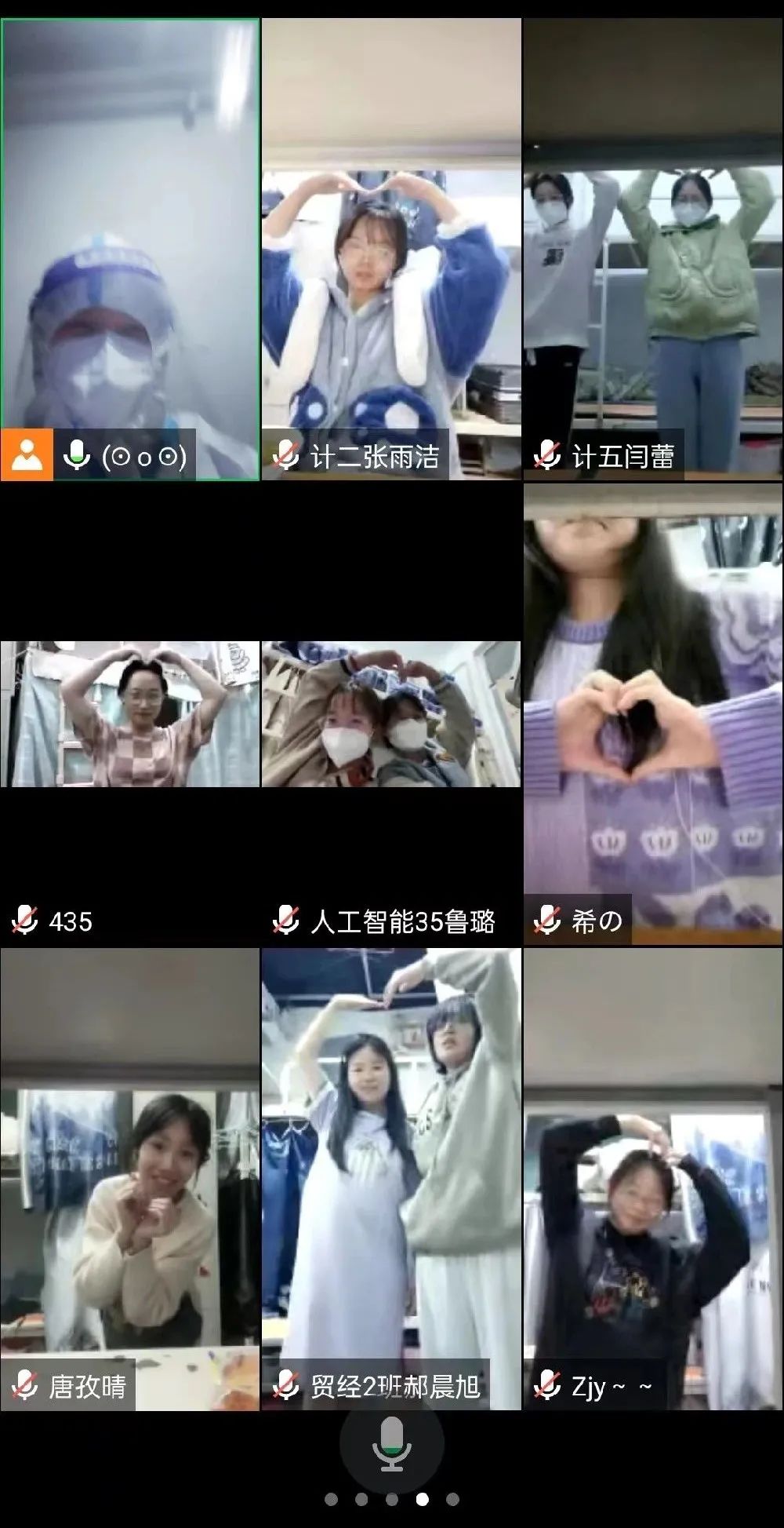 为了丰富宿舍生活,让“足不出寝”学生保持健康向上的身心状态,贾晶晶老师就开始组织学生开展“每日一跳”:大家在一天的某一个时间里,同时在楼层群里打开摄像头,一起做些简单、欢快的健身操。即强身健体,又释放压力。前几日的“每日一跳”最后一个动作刚刚结束,学生们不约而同地对着摄像头向她比了大大的爱心,贾晶晶老师说:“那一瞬间我的内心真的被孩子们的‘爱心’填满,感受到了一股股温暖的力量萦绕在身边,给予我十足动力,消除了一身疲惫。”