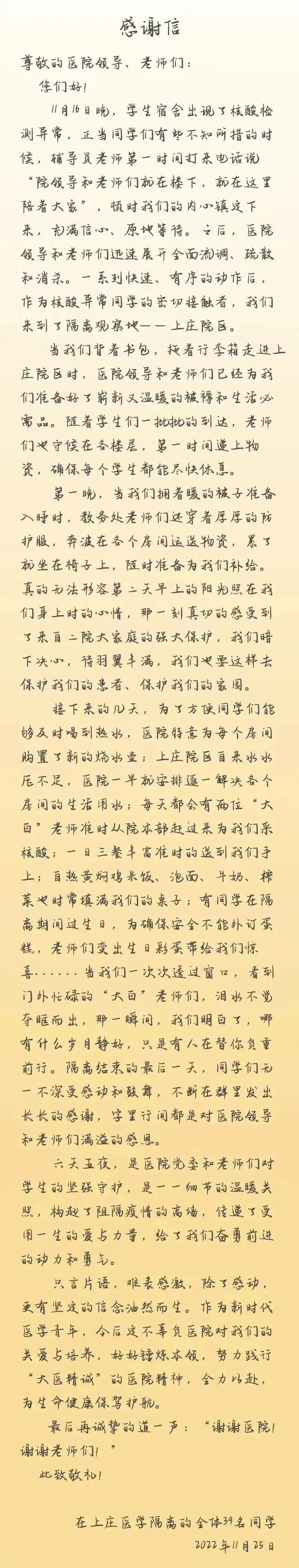 纸短情长,道不尽的感谢。11月25日,我校第二医院辅导员曹雯雯老师的手机上收到了一封来自上庄院区隔离点39名学生的感谢信。看完饱含着同学们真挚情感的感谢信,她的脸上露出欣慰的笑容,“很开心孩子们从中懂得了感恩,希望疫情早点结束,摘掉口罩,让我再见面时露出最美的笑脸。”这封信在一直忙碌操劳的老师们中间传开,这让老师们倍感温暖,也进一步提振了大家团结一致战胜疫情的信心与决心。