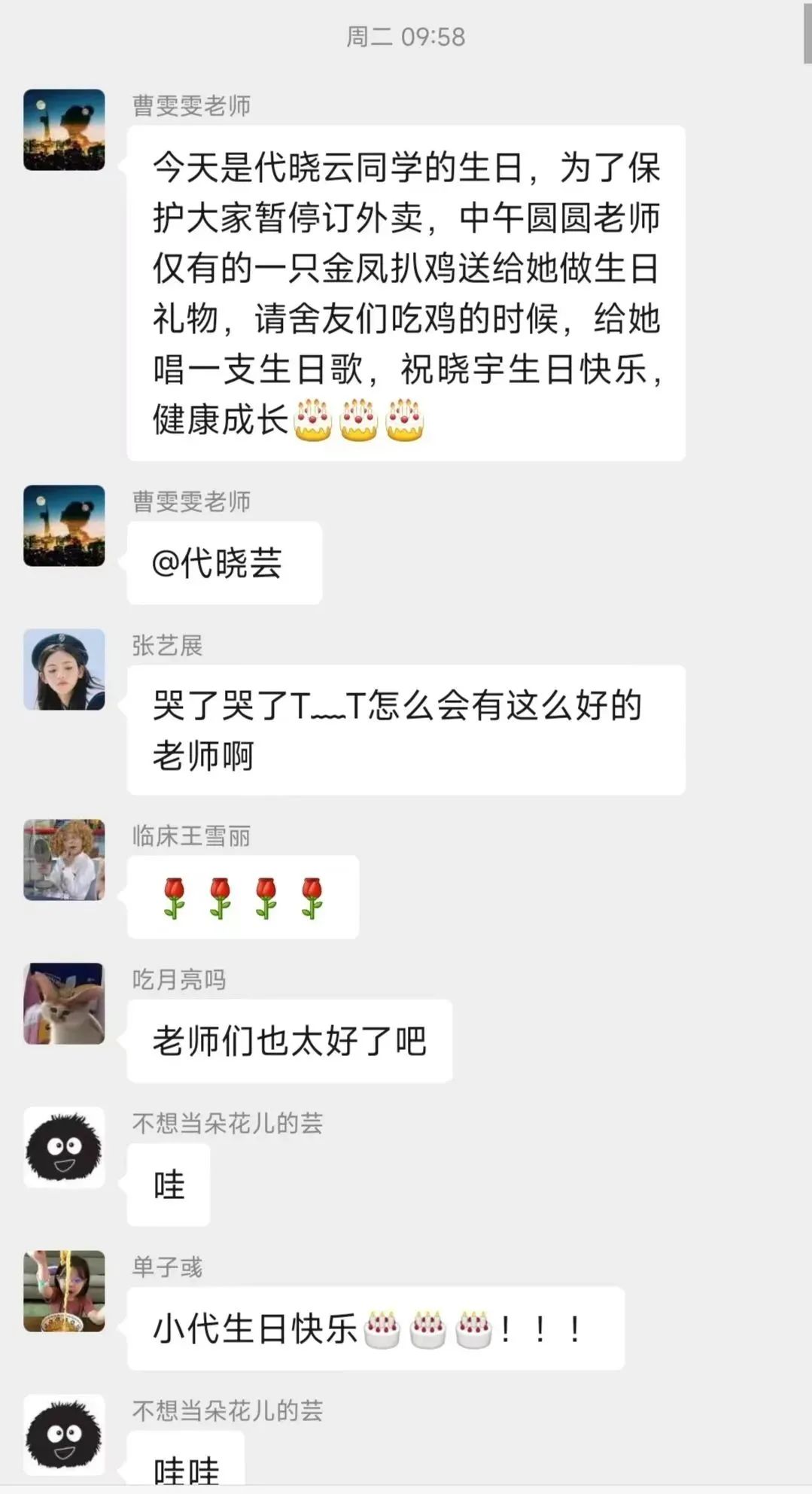 有的同学这样写道:“‘孩子们,做核酸啦!’‘孩子们,吃饭啦!’那日渐沙哑的嗓音背后,是各位老师为了我们这群孩子,舍下了家里自己的孩子,真切地让我们感受到了家的温暖。疫情面前,寒冬不寒。有您们在,我们很安心!”