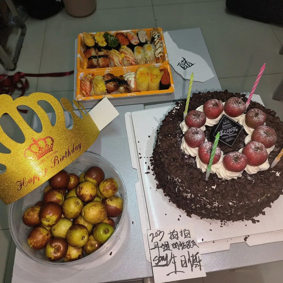 我们是大一新生,提前得知舍友生日,其他人想给她准备一个惊喜。我们组建了一个群,通过套话知道她喜欢吃日料,喜欢吃酸的。点了日料外卖,特地把蛋糕上的水果换成了山楂。在她生日那天给她准备了一个大大的惊喜。她事先什么也不知道。