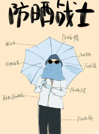 出行时记得积极使用防晒衣、遮阳帽、遮阳伞、冰袖、医用或者冰丝防晒口罩……