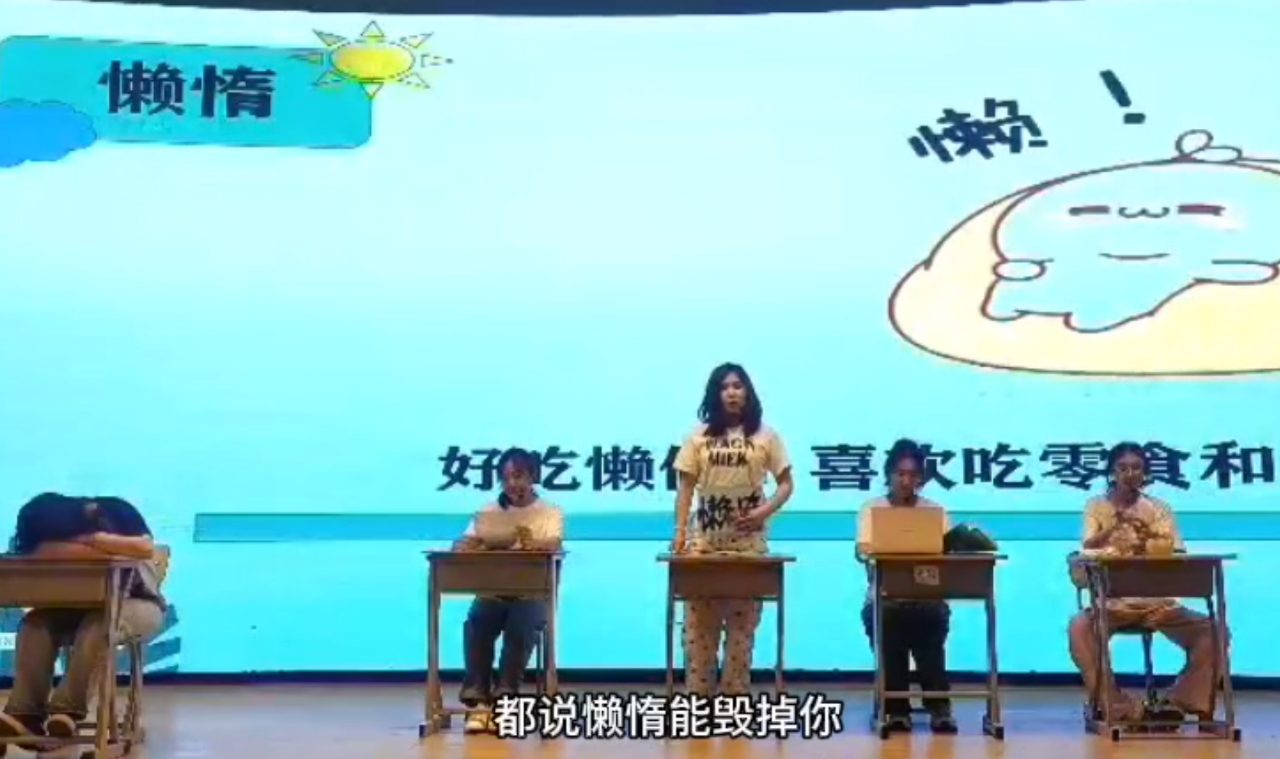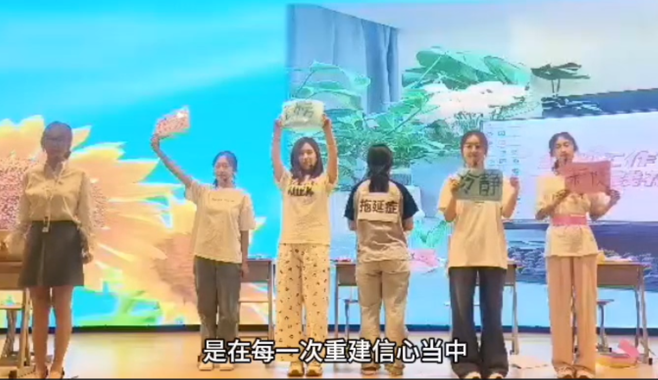 《拖延症OUT》原创心理情景剧由燕京理工学院人文教育学院孙雅钗副书记、心理站长吕丽琴老师联合指导,学生李璐婕、陈艺萌、潘若溪、韩葭晨、郭亚伟、王子越等主演。剧情主要讲述了周柳因拖延症对工作发牢骚,其拖延症的四个特征显现并开始争执。周柳选择睡觉逃避一切,特征们进入周柳(六)梦中争吵,女主管说明因周六拖延导致周日去世的消息,周柳惊醒,幡然醒悟,立志开始摆脱拖延。